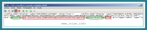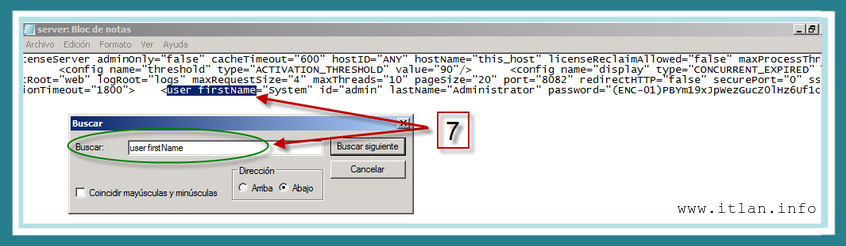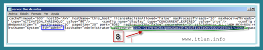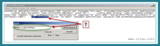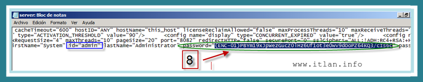 fichero se abrirá en texto plano, buscar la siguiente entrada con la referencia “userFirstname”, os aparecerá una cadena similar a esta “<user firstName="System" id="admin" lastName="Administrator" password="(ENC-01)LKJ338u98uxkllS(*U+ljljlja-$78923ghJgs" passwordExpired="false"