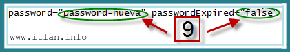 Paso 8: Cambiamos el "password", dentro de la comillas introducimos uno nuevo e nuestro caso "password-nuevo" y cambiamos el campo passwordExpired a "true".
