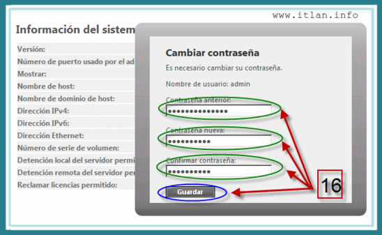 Paso 13: Volvemos a la consola del Servidor de Licencias e introducimos nuevamente "Usuario:admin" y la nueva contraseña modificada en el bloc de notas "password nuevo", y pulsamos "Enviar".