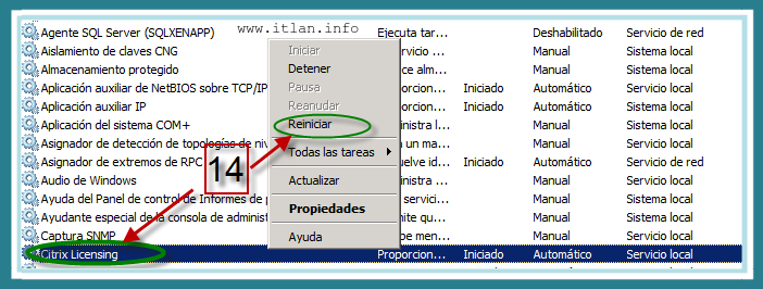 Paso 12: Buscamos los servicios del Servidor de Licencias de Citrix y los "Reiniciamos".