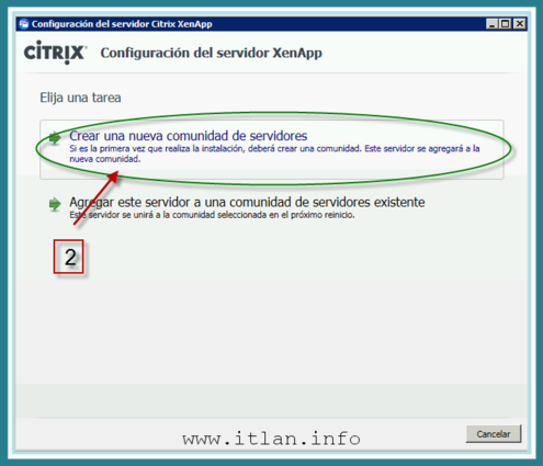 El primer paso en el asistente de Configuración de XenApp, es seleccionar “Crear una nueva comunidad de Servidores o Granja”, o “Agregar este servidora una comunidad de servidores existente”. En nuestro caso debido a que este es nuestro primer servidor seleccionamos la primera opción “Crear una nueva comunidad de Servidores”.