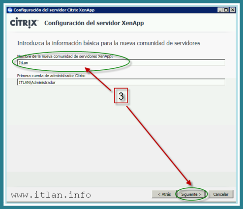 Cada Comunidad “Granja”, desde este momento la denominare siempre “Comunidad”, debe de tener un único nombre, así el primer paso será introducir el nombre de la Comunidad, en nuestro caso “ItLan”. El siguiente apartado nos solicita el primer nombre del Administrador, por defecto el usuario que inicio la sesión rellenara el campo automáticamente, pero el usuario se podrá cambiar cuando sea necesario, siempre que tenga derecho de Administrador del dominio, en nuestro caso el Administrador del Sistema “ITLAN\Administrador”.