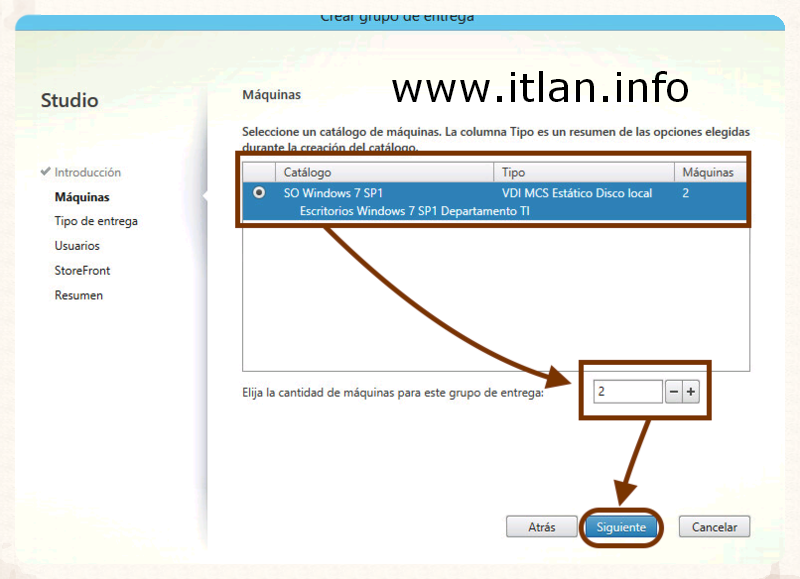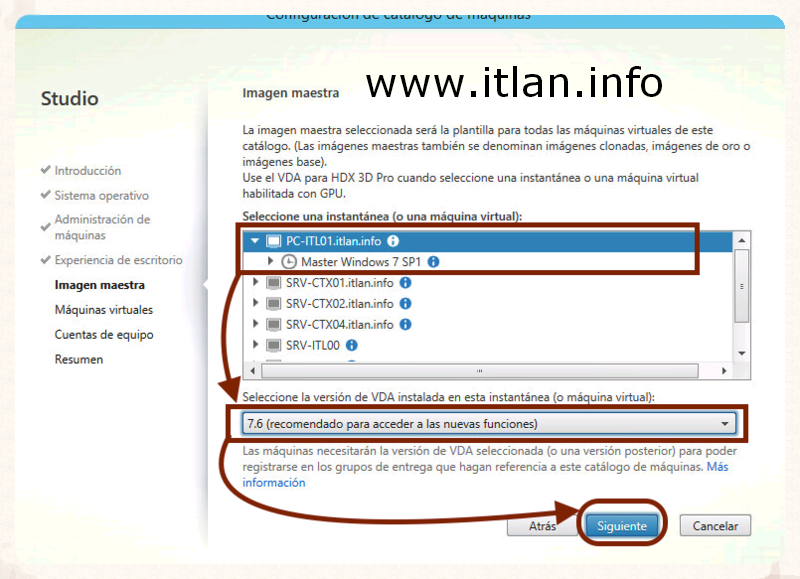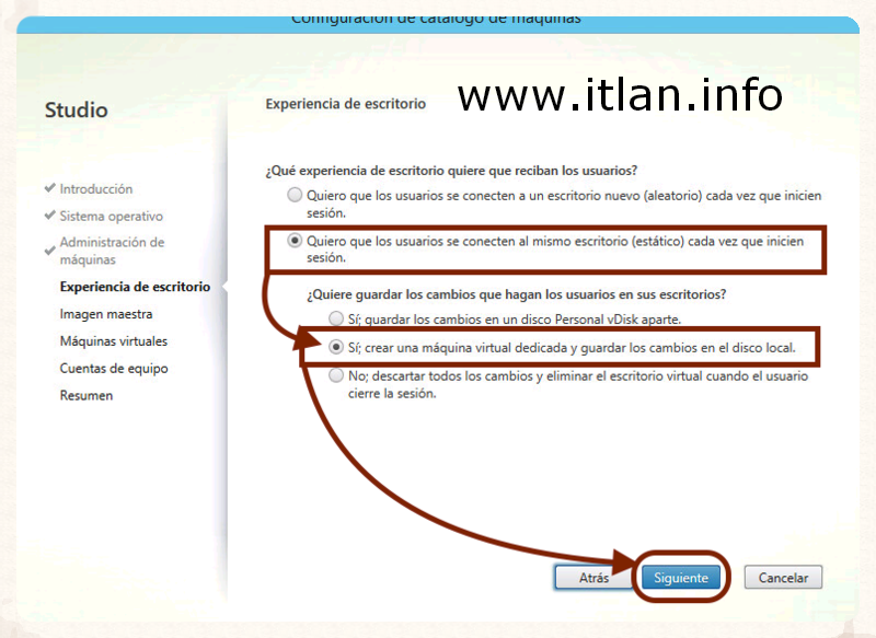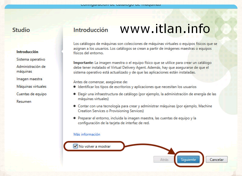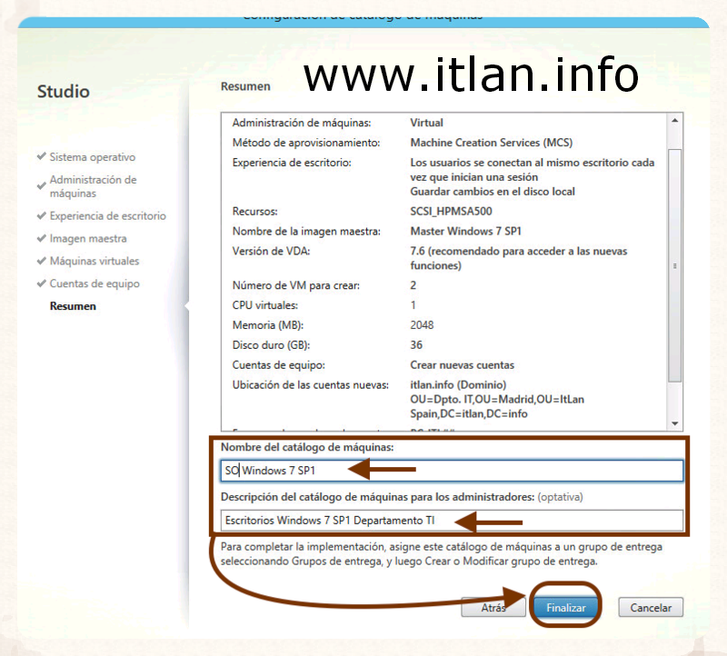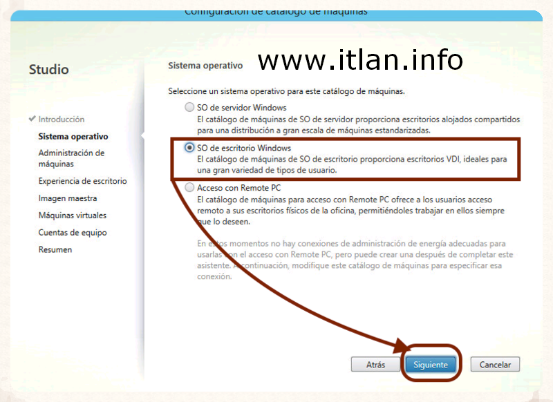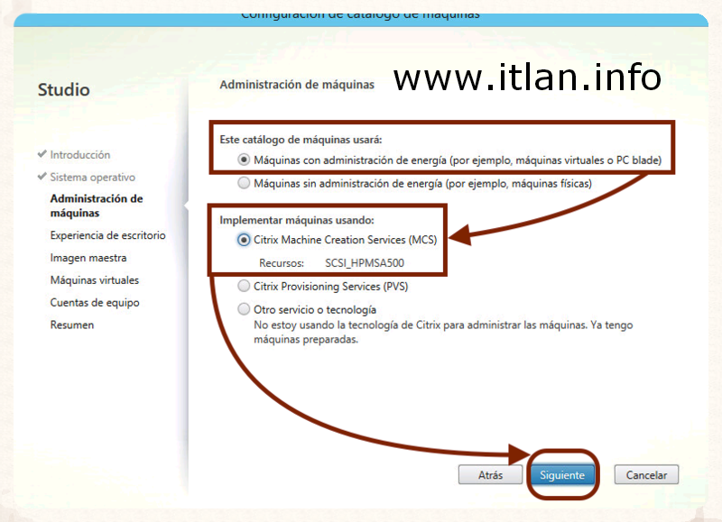 Especificamos si el catálogo de máquinas usará VM o Máquinas Físicas, en nuestro caso he creado la infraestructura desde VMware vSphere 5.5, por lo que elegiré la primera opción "Maquinas con administración de energia...". A continuación nos preguntará el modo de despliegue de las máquinas que creará, elegirémos "Citrix Machine Creation Services (MCS)".
