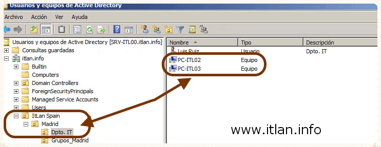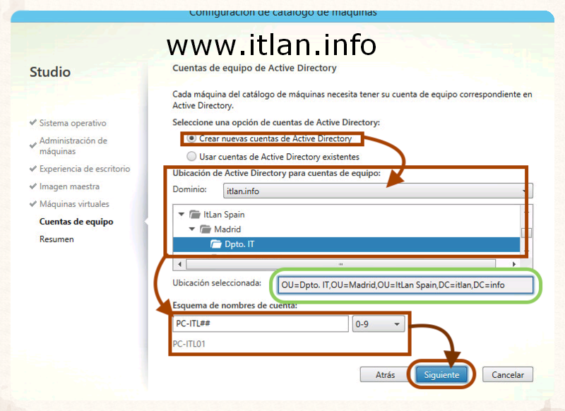 En el Paso 8 nos pedirá donde queremos alojar nuestras VM dentro de nuestro Directorio Activo (Active Directory). En mi caso, he configurado la siguiente estructura de "OU=ItLan Spain -> Madrid -> Dpto. IT" para que las máquinas del laboratorio "Dpto. IT" se encuentren controladas en esa ectructura para poder crear GPO posteriormente si fuese necesario.
