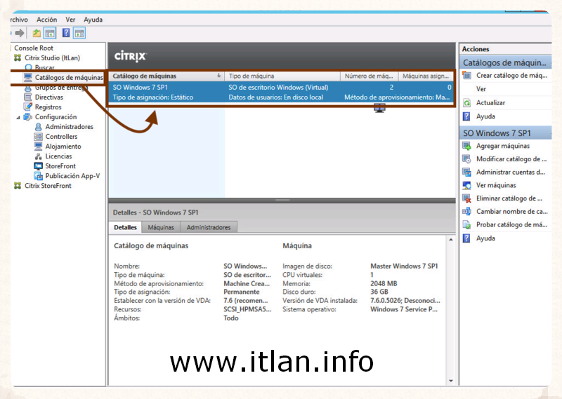 Las colecciones de máquinas físicas o virtuales se administran como una entidad única, llamada Catálogo de Máquinas de sesión. Muchas implementaciones crean una plantilla o imagen maestra en el host. A continuación, la usan en el catálogo de máquinas como una guía para las herramientas de Citrix (por ejemplo, Machine Creation Services o Provisioning Services) para crear máquinas virtuales a partir de la imagen o plantilla. Un catálogo también puede contener máquinas físicas.