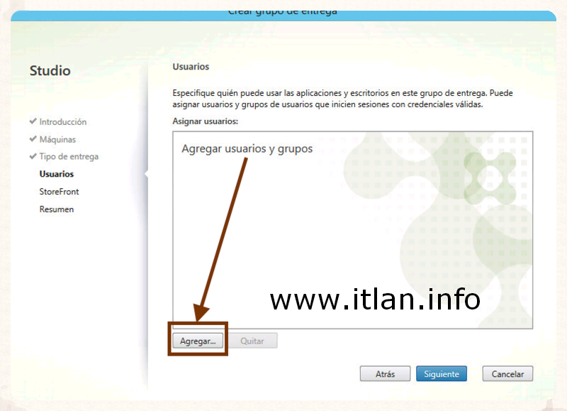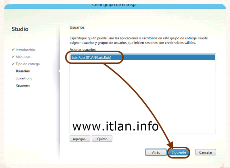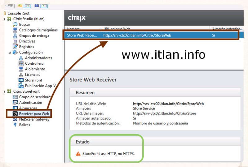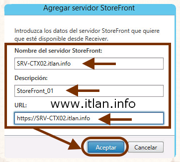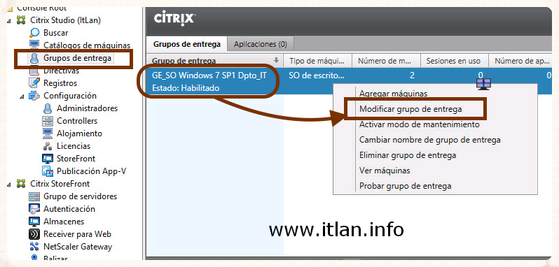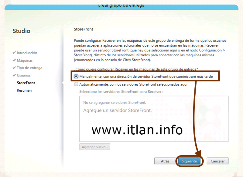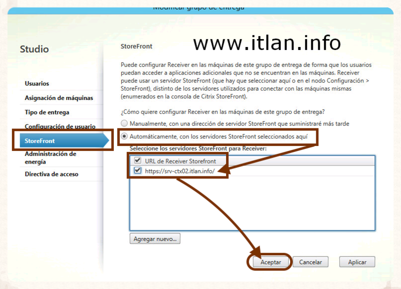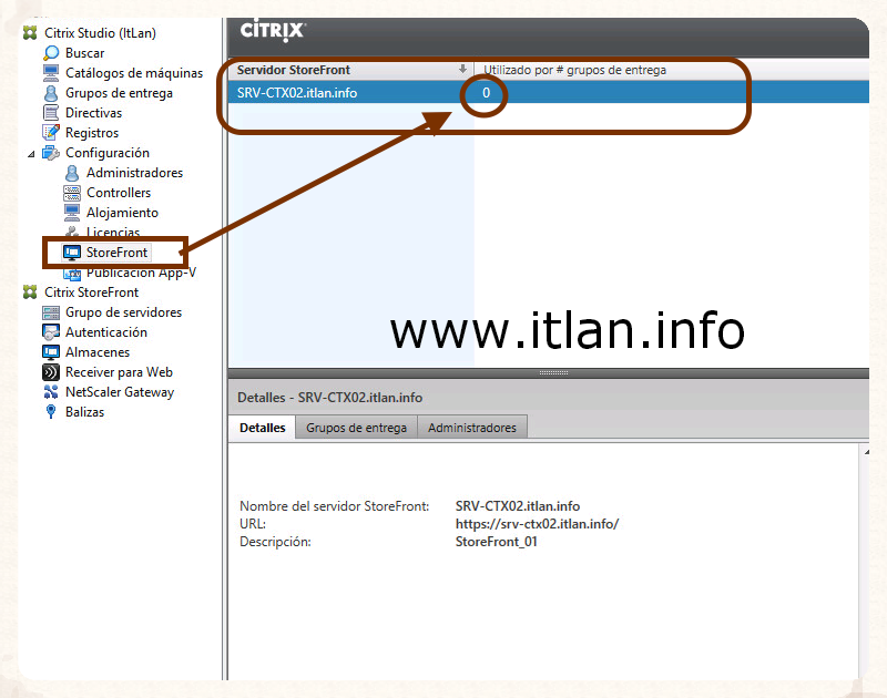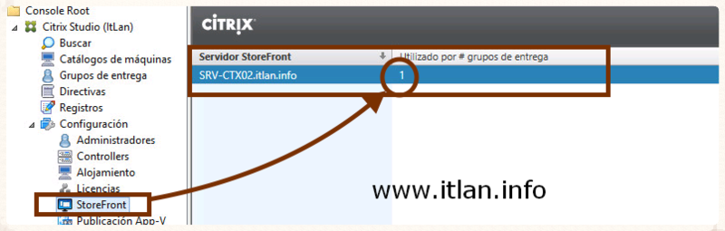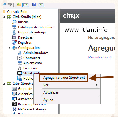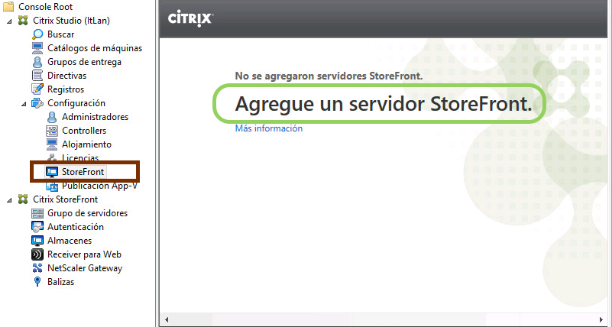 Una vez configuradas nuestros Grupos de Entrega para los Escritorios, deberemos darles acceso mediante StoreFront a los clientes Receiver, para ello debemos configurarlo. Nos posicioanmos en "Citrix Studio" -> "StoreFront" botón derecho del ratón “Agregar servidor StoreFront” para poder administrar y configurar los sitios, tambien podemos Agregar el Servidor StoreFront, desde el menú "Configuración".