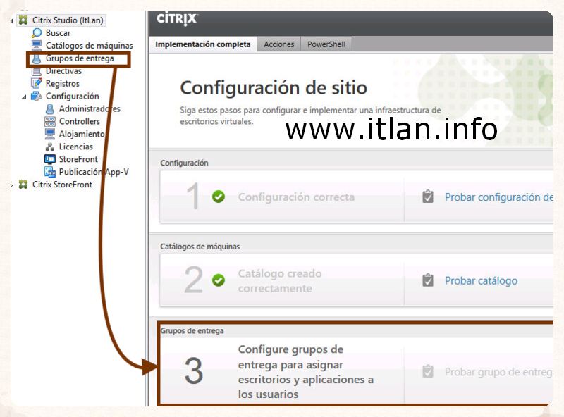 Después de crear un Catálogo de Máquinas, se ejecutan pruebas automáticas para comprobar que se ha configurado correctamente. Una vez completadas las pruebas, generan un informe que se podrá ver. También podremos ejecutar pruebas posteriores a voluntad desde Citrix Studio <nombre de sitio> en el panel de navegación de Studio.