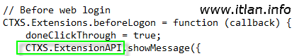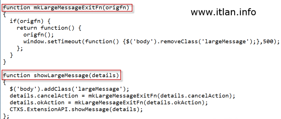 Como veréis el cuadro de dialogo que usa Citrix esta prediseñado por la función CTXS.ExtensionAPI.ShowMessage, en nuestro caso vamos a personalizarlo diseñando el cuadro con otro tamaño, tamaño y color de la fuente, dejarlo un “poco” más chulo y que nuestro mensaje, tenga contenido. Pero para realizar este paso, necesitamos un poco más trabajo. Os facilito una función (Paso 4), para realizar esos cambios, la función se llama showLargeMessage y tenéis que sustituirla por la viene por defecto CTXS.Extension.API.showMessage, (Paso 6) para poner una caja de dialogo más grande. La función esta sacada del blog de Citrix y como comprobareis en vuestra maqueta, funciona perfectamente.