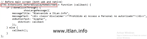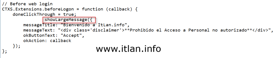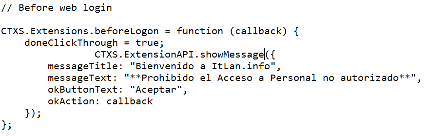 La primera personalización que veremos “Disclaimer” , tiene dos versiones de código en el mismo fichero (script.js), la primera se realiza antes del Inicio de Sesión en el navegador web y la segunda interfaz, una vez iniciada la sesión el cliente receiver. Se puede utilizar una opción o ambas. Mi recomendación es que mantengáis ambos mensajes, ya que poner únicamente el mensaje de Inicio Previo, no es recomendable. El acceso de Inicio de Sesión, solo se verá en la navegadores web (Clientes Nativos de vuestra LAN/WAN), pero no se mostrara si el usuario está accediendo desde un portal externo mediante NetScaler, pero al activar la segunda opción, el Disclaimer si se mostrara.