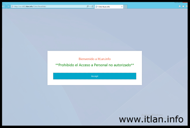 Por ultimo en este artículo, vamos a configura nuevamente el Disclaimer, pero esta vez para los usuarios externos y que se conecten mediante un portal desde NetScaler . En el Paso 16 tenéis el Inicio de Sesión y el Paso 17, os muestra el Disclaimer una vez Iniciada la Sesión.