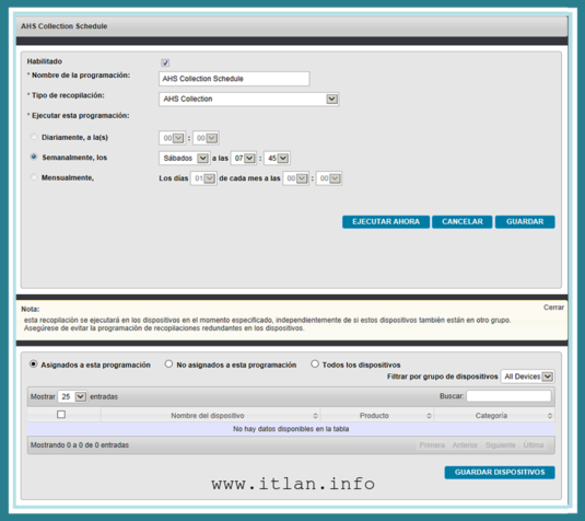 Para Modificar un apartado Pasos 1-2, únicamente deberéis de hacer “clic” en la opción de menú correspondiente en nuestro caso “AHS Collection Schedule”, a la derecha de vuestro monitor os aparecerán los campos modificables de la actualización, “Nombre de la programación, Tipo de Recopilación, etc..”, aquí podréis definir cuando queréis que se realice la tarea o ejecutarla en ese mismo momento.