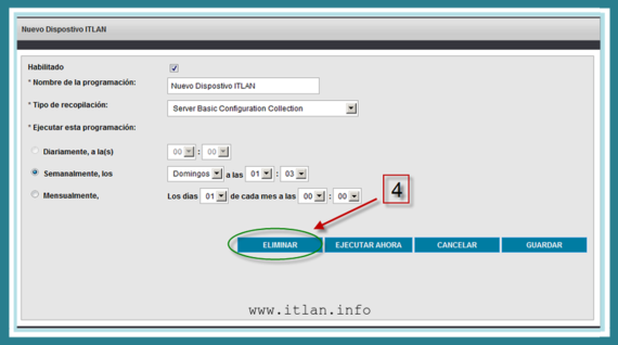 En el panel Lista de programaciones de recopilación podéis ver los botones, modificar, ejecutar o eliminar programaciones de recopilación de configuración., Paso 6.