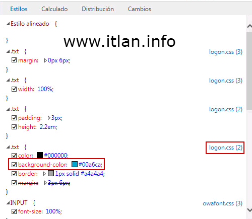 Para cambiar el color de los cuadros de introducción de datos mdoficaremos el fichero logon.css sustituyendo el código fff3c0 (amarillo) x 00a6ca (azul claro) observar la línea (2) del código ; background-color:# [código color hexadecimal].