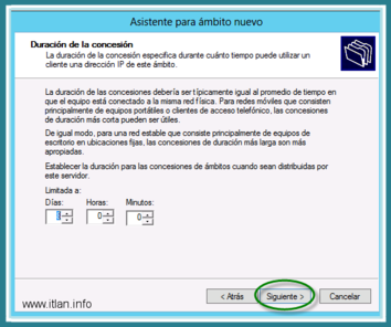 os quedéis sin direcciones IP disponibles, lógicamente en redes grandes, con usuarios móviles y otros tipos de equipos que no estén fijos en la red. Microsoft recomienda entre 1 y 3 días para