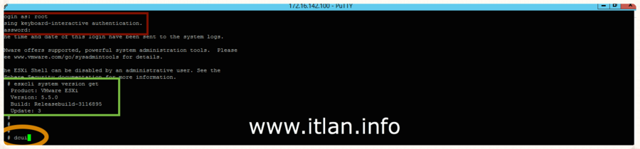 Recordar que para conectarnos vía PuTTY, nos solicita nuestro usuario, en nuestro caso no tenemos otro por el momento "root" y el password. Una vez accedido os he puesto un comando de linux para vMware para obtener información de nuestro ESXi (no está mal saber alguna cosa más, y tambien para hacer la pantalla un poco más grande), a continuación escribimos el comando que nos interesa para acceder remotamente a nuestra consola "DCUI".
