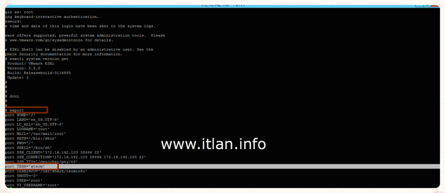 Para ello, utilizaremos un comando de Linux denominado "export" con la variable de entorno "TERM", que por defecto tiene el valor asignado en "xterm", que es el tipo de terminal asignado, debemos de cambiar éste valor a "linux", con el cambio conseguiremos visualizar la pantalla de nuestro DCUI en el color Amarillo que todos conocemos.