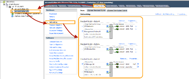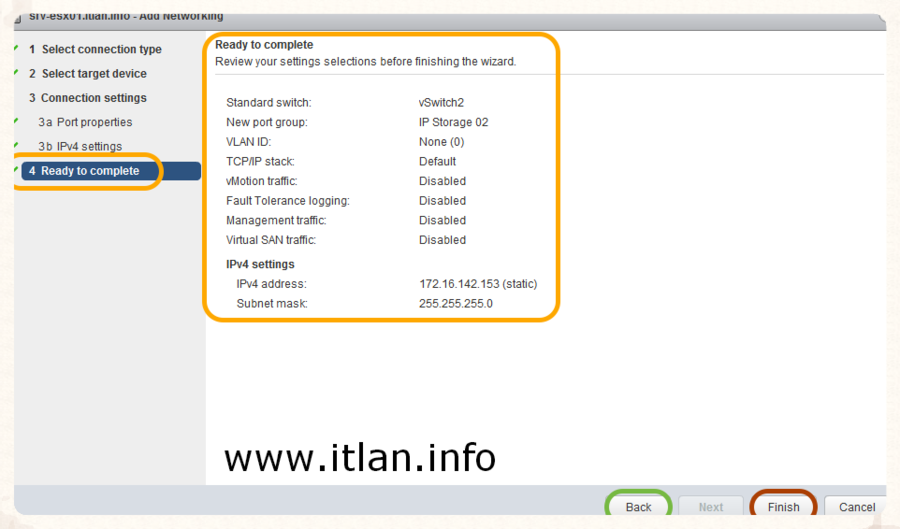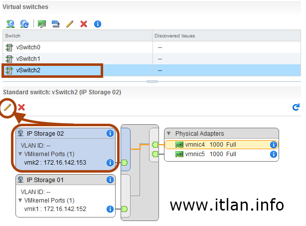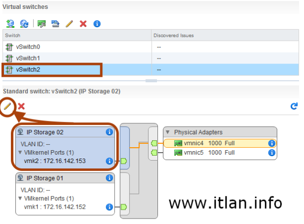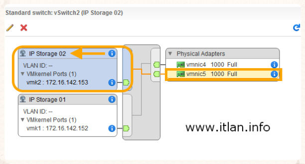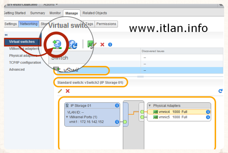 Continuamos con las "patas de nuestra mesa", en este laboratorio de networking vamos a crear una nueva Red ISCSI totalmente separadas de las anteriores y redundante. La nueva Red la utilizaremos para gestionar nuestro tráfico de cabina (iops de disco en nuestro openfiler), para ello utilizaremos una IP libre del mismo rango que nuestra cabina de discos, recordar que nuestra cabina openfiler tiene la dirección IP 172.16.142.150 (más información Configuración de Openfiler 2.9), para ello crearemos y configuraremos nuestros puertos vKernel para acceder a nuestro almacenamiento.
