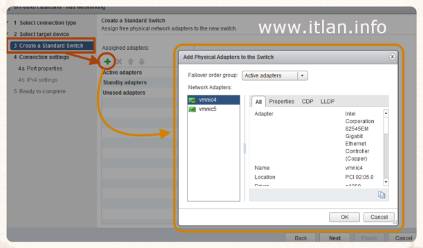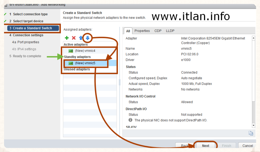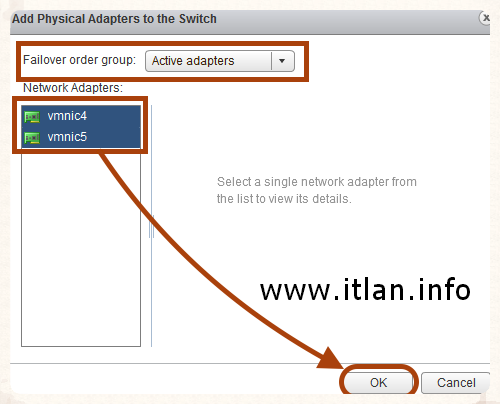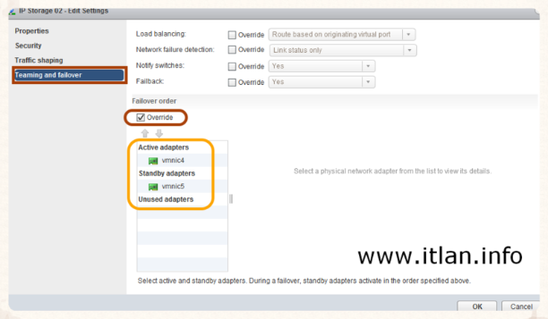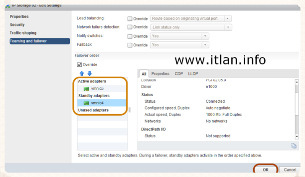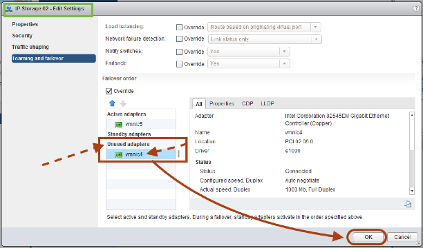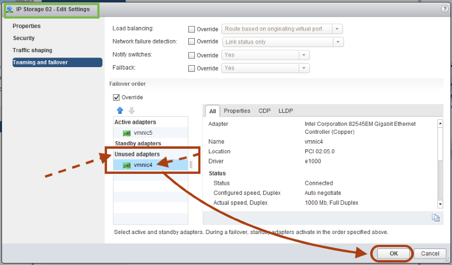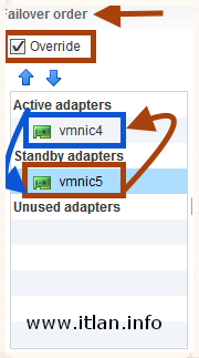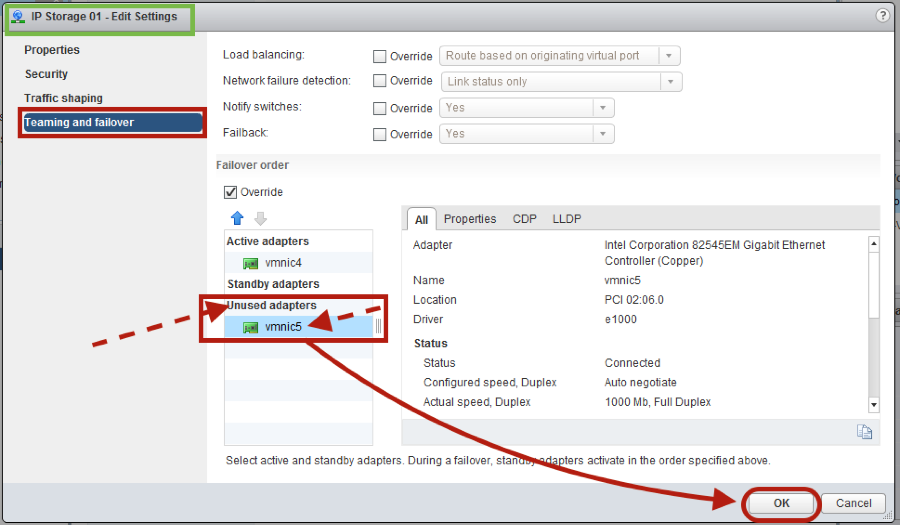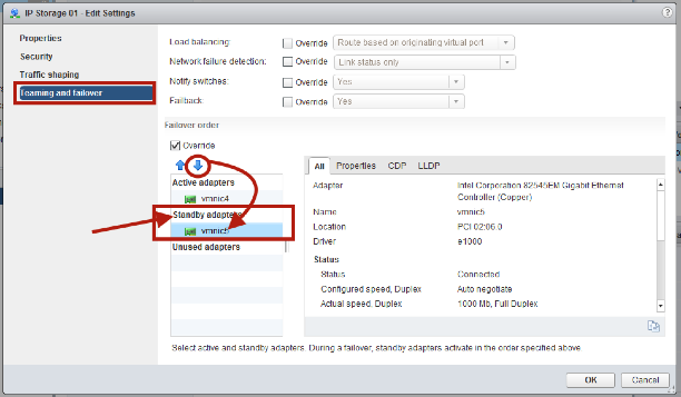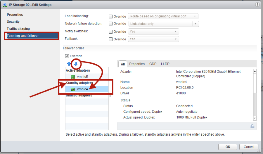 Observar que tenemos nuestra primera NIC "vmnic4" en "Active adapteres" y la seguda en "Standby adapters", tenemos que cambiar la posición de ambas, poner la "vmnic5" como "Active adapters" y la "vmnic4" como "Standby adapters" para eso utilizaremos la felchas azules de subir y bajar seleccionando previamente la NIC.