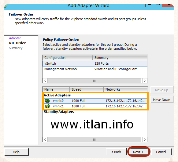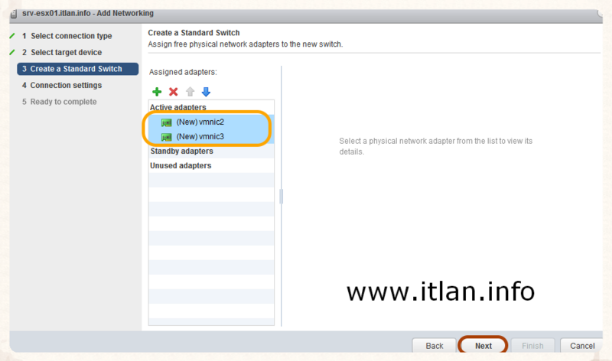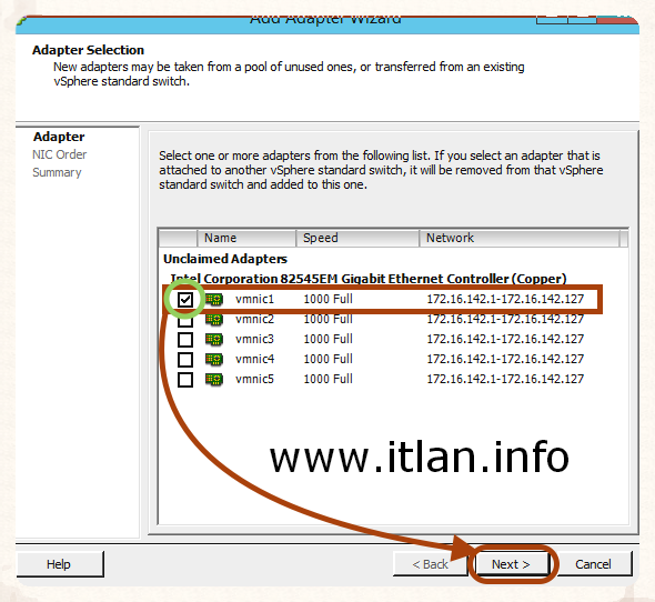 Paso 4: Nos muestra las Nic disponibles, seleccionamos nuestra "vmnic1" y pulsamos el botón "Next".