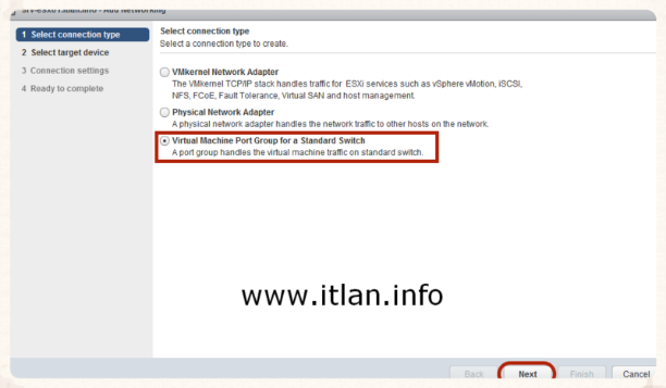 Paso 10: Empezamos la creación de nuestro vSwicth Standard, seleccionamos "Virtual Machine Port Gropup for a Standard Swicth" y pulsamos el botón "Next".