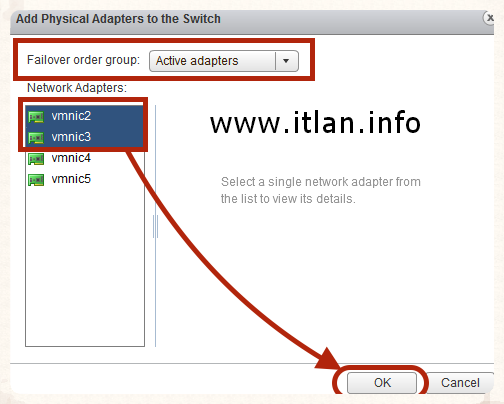 Paso 13: Seleccionamos las NICs que queremos asignar a nuestro VSS, en nuestro caso "vmnic2" y "vmnic3" y pulsamos el botón "OK" para continuar.