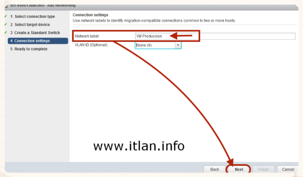 Paso 15: Le damos nombre a nuestro Port Group "VM Produccion" y pulsamos el botón "Next" para continuar.