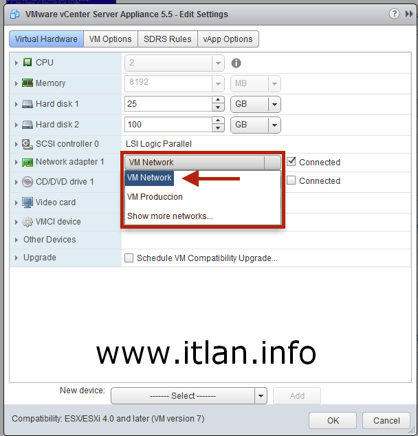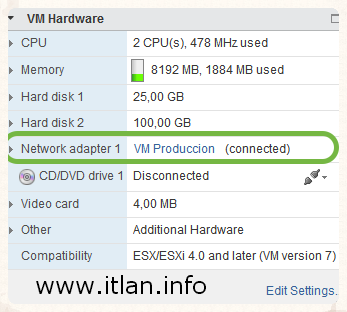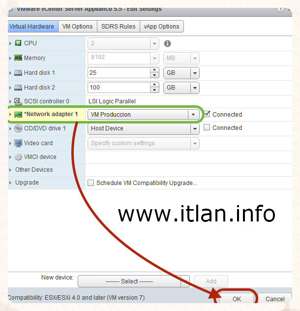 Paso 21: Cambiamos el Network adapter 1 que actualmente lo tenemos en "VM Network" por "VM Produccion".