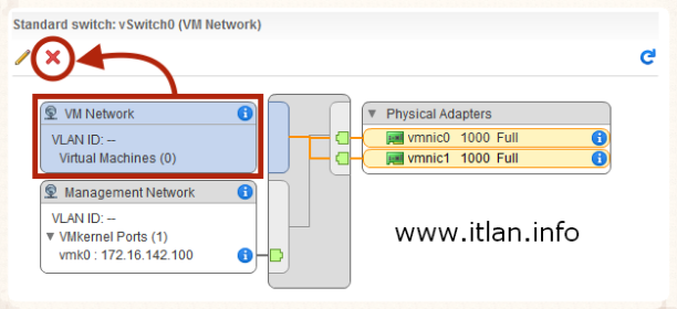 Paso 26: Una vez posicionados en "VM Network" de nuestro "vSwicth0" pulsamos el icono rojo "X" para proceder a eliminarlo.