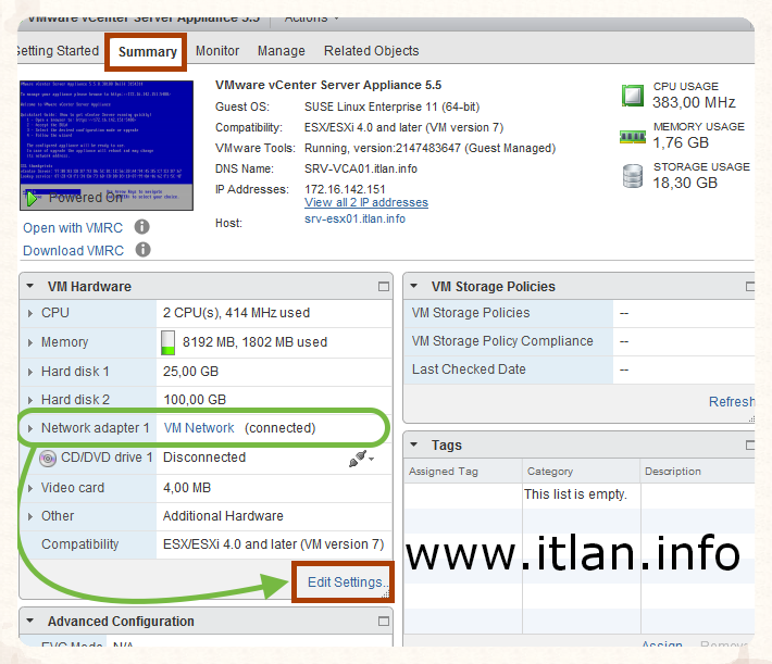 Paso 19: Nos posicionamos en la Pestaña "Summary" de la VM que queremos cambiar el adaptador y seleccionamos la opción "Edit Settings...", se nos desplegará una nueva ventana donde podremos Editar todas las opciones de nuestras VM.