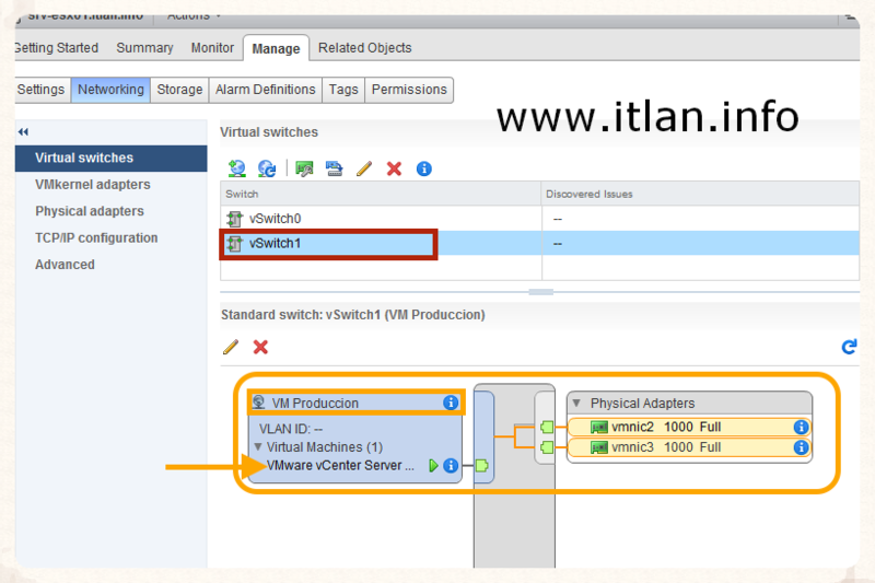 Paso 24: Resumen de nuestro nuevo "vSwicth1", en el cual observareis que nuestra VM "VMware vCenter Server" ya esta gestiona el trafico por nuestro "vSwicth1".