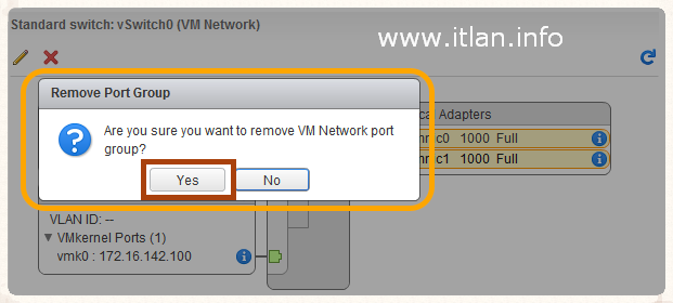 Paso 27: Nos pregunta si estamos seguro de que quermos eliminar el Port Group "VM Network", pulsamos el botón "Yes".