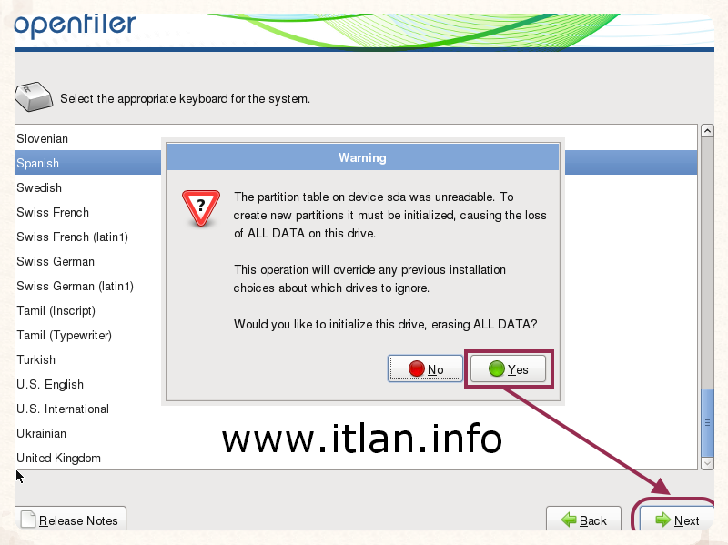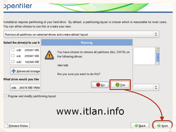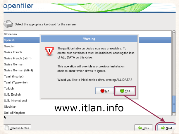 Paso 6: Nos informa que nos borrará los contenidos de las particiones, lo confirmamos si estamos seguros y pulsamos en botón "Yes" para continuar.