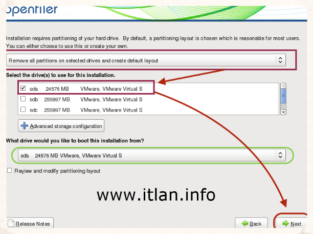 Paso 7: En nuestro caso podéis ver tres de los cuatros discos de almacenamiento que utilizaremos posteriormente, seleccionamos el de 24Gb (24576 MB)y procedemos a formatearlo, pulsamos 3 el botón "Next" para continuar.