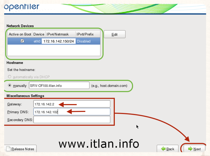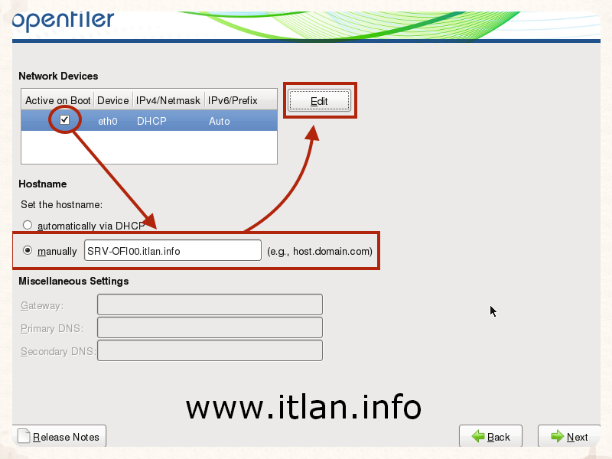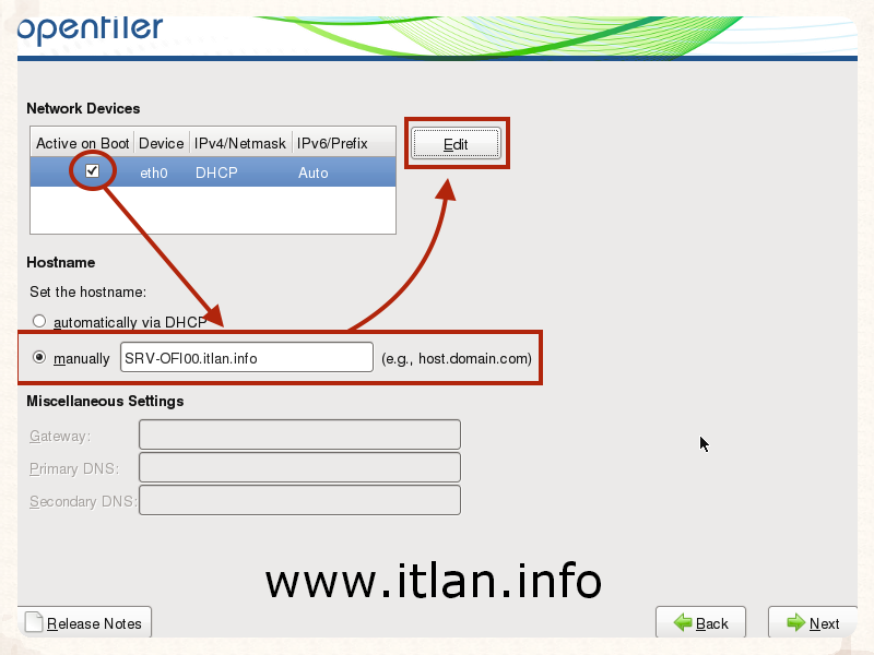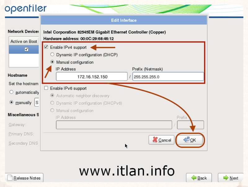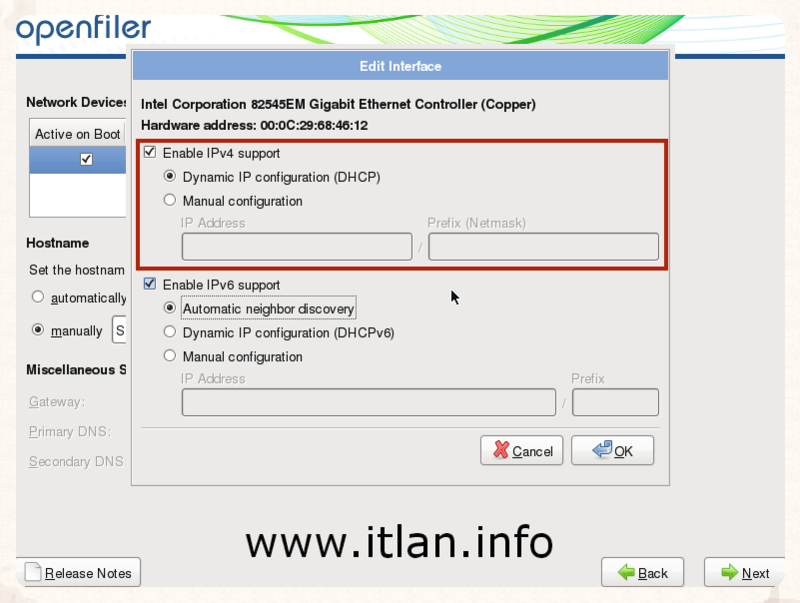 Paso 9: Aquí configuraremos la red del openfiler, activamos las interfaces que nos interesen, configuramos el hostname manualmente "manually" , el nombre de nuestro host "SRV-OFI00.itlan.info" y pulsamos el botón "Edit" para configurar nuestra IP.
