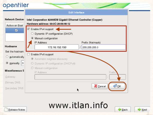 Paso 11: Desmarcamos IPv6, en el apartado "Enable IPv4 support", marcamos la opción "Manual configuration" en IP Address" 172.16.152.150", Netmask "255.255.255.0" y pulsamos en botón "Ok" para continuar.