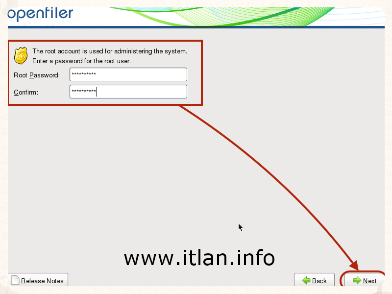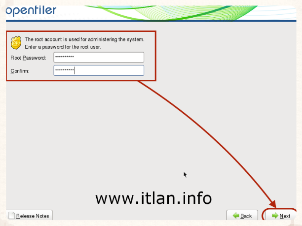 Paso 14: Introducimos la contraseña para el usuario root, pulsamos el botón "Next" para continuar.