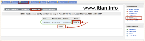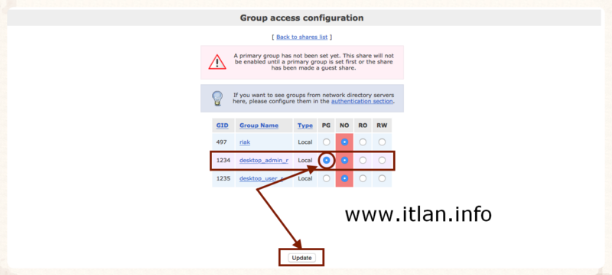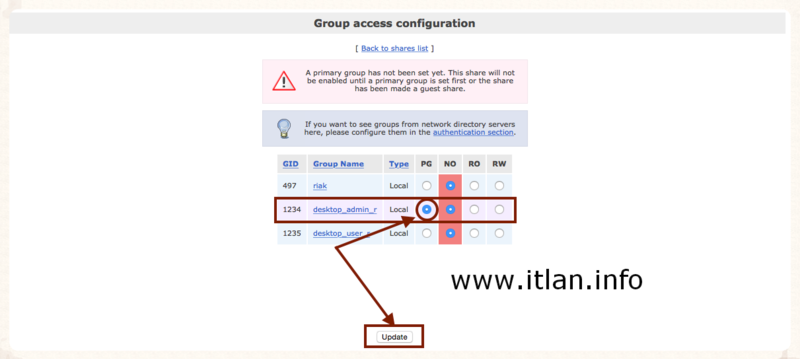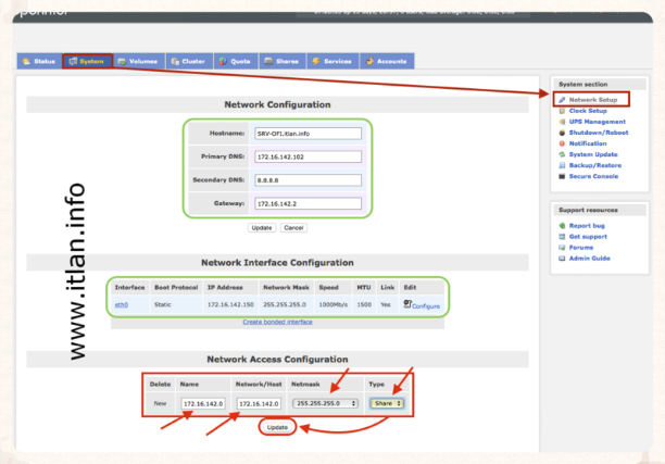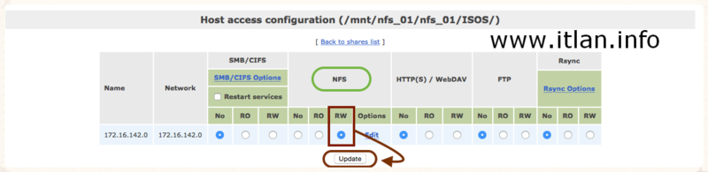 Paso 56: Como observáis en la imagen debemos configurar el grupo principal y configurar el acceso "ReadWrite" para NFS en todos los servidores o toda nuestra LAN, a continuación pulsamos el botón "Update" para guardar los cambios.