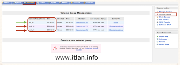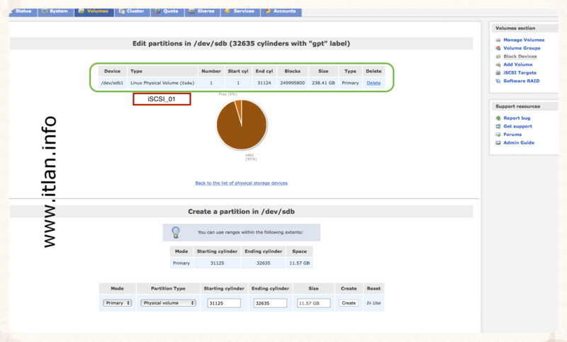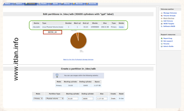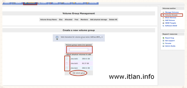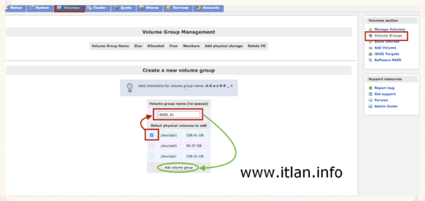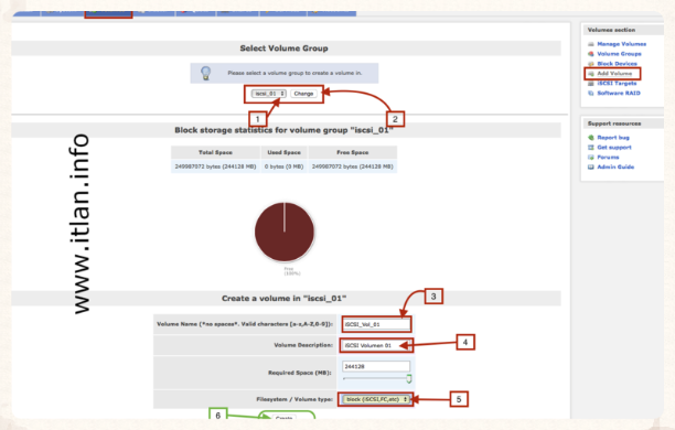 Paso 28b: Marcamos nuestro primer voluen a crear de 250 Gb, acto seguido le ponemos un nombre al volumen, en nuestro caso "iSCSI_01" y pulsamos el botón "Add volume group". Realizamos este mismo paso con los otros dos discos restantes.