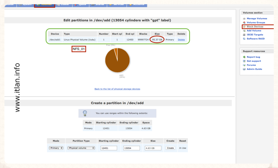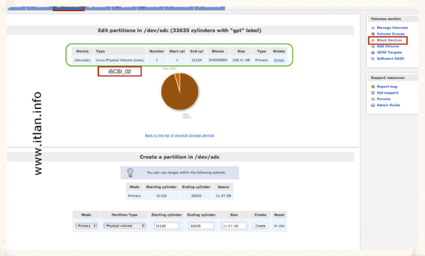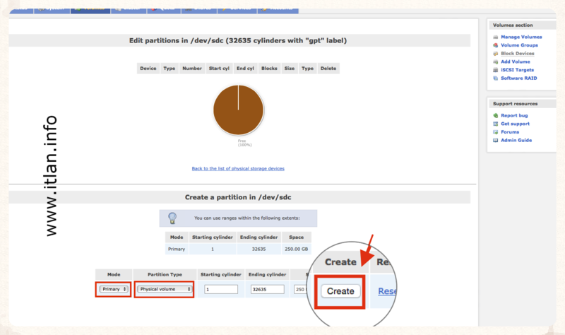 Recordar que nuestro appliance lo vamos a configurar para el almacenamiento de nuestras VM (iSCSI) y ISO's (NFS), en la imagen del Paso 23 podeis observar los tres discos que vamos a gestionar su partición, para ello tendremos que realizar el mismo proceso para cada disco. Pinchamos en nuestro primer disco de 250Gb
