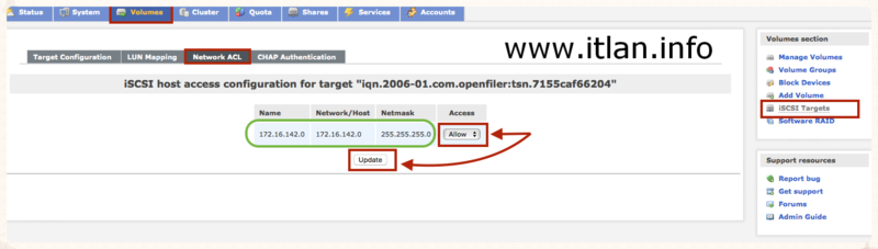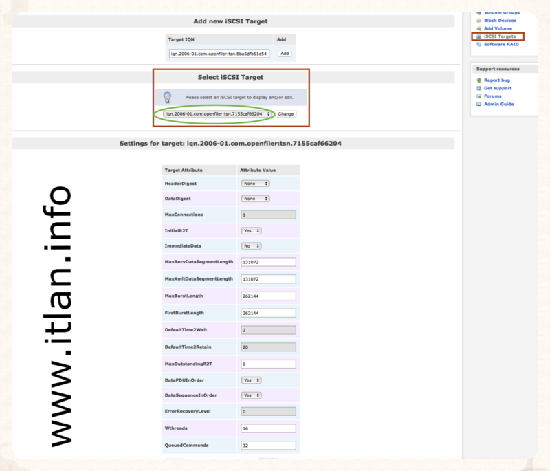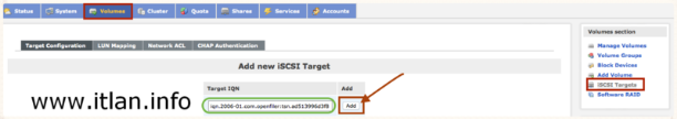 Ya tenemos configurados los discos, ahora es el momento de configurar nuestro inicializador iSCSI, para eso vamos a la pestaña "Volumes" -> iSCSI Targets".