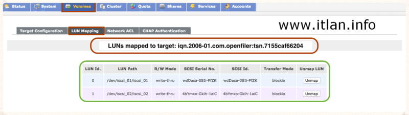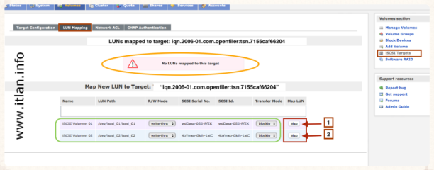 Paso 33: A continuación, debemos asignar las LUN a nuestro conector iSCSI creado, como podéis ver en el recuadro naranja no extiste ninguna LUN asignada, pulsamos el botón "Map" para añadir las LUN.