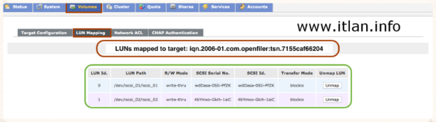 Paso 29: Una vez creados los Volumenes nos mostrara la siguiente pantalla, con los nombres de nuestros volumenes "iSCSI_01 - iSCSI_02 - NFS_01".