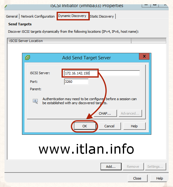 Paso 38: Nos aparecera la siguiente ventana, hacemos click en la pestaña "Dynamic Discovery", botón "Add.." añadimos la IP de nuestro openfiler 2.99 -> "172.16.142.150", el puerto "3260" por defecto y botón "OK".