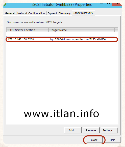 Paso 39: Una vez introducidos los valores anteriores Paso 38, nos desplazamos la pestaña "Static Discovery" y comprobamos que aparece nuestra controladora iSCSI creada en openfiler 2.99. Pulsamos el botón "Close" para volver a nuestra consola de gestión.
