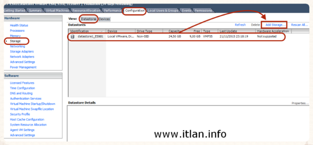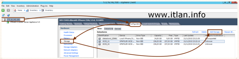 Paso 41: Procedemos a la carga de nuestra LUN. Nos posesionamos en la pestaña "Configuration" -> "Storage" -> "Datastores" -> "Add Storage...". En la imagen os muestro recuadrado en rojo nuestro Datastore Local.