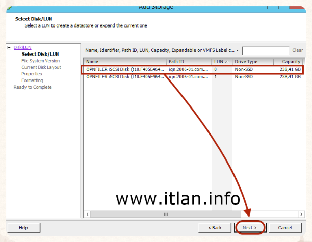 Paso 42: Nos apareceran nuestras dos LUN, seleccionamos la primera LUN (0) y pulsamos en botón "Next". Este mismo proceso tendreis que realizarlo nuevamente para instalar la segunda LUN (1).