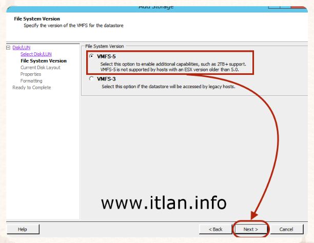 Paso 43: Seleccionamos el formato -> File System Version -> VMFS-5 y pulsamos el botón "Next".
