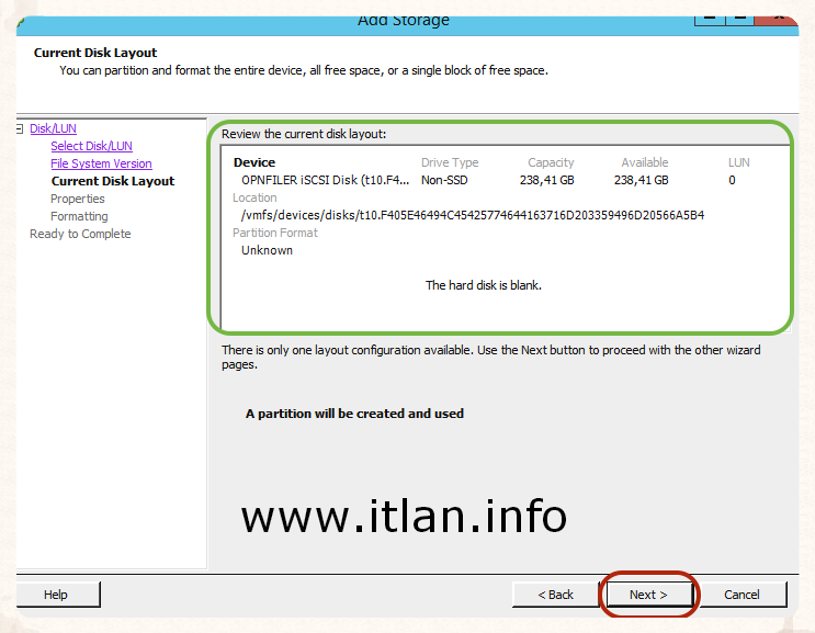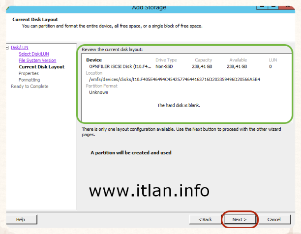 Paso 44: Nos muestra un Resumen de nuestra nueva LUN (0) seleccionada. Location, Device, Capacity, etc.. pulsamos el botón "Next" para continuar.