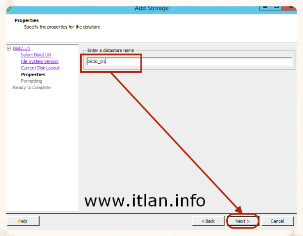 Paso 45: Introducimos el nombre de nuestro Datastore, en nuestro caso "iSCSI_01" para la primera LUN (0) y "iSCSI_02" para la segunda LUN (1), a continuación pulsamos el botón "Next" para continuar.