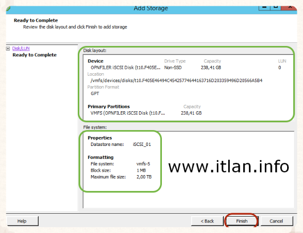 Paso 47: Nos muestra un Resumen de nuestra configuración, en el caso de que todo sea correcto pulsamos el botón "Finish" para terminar la configuración de nuestra primera LUN (0), en caso contrario iremos hacia atrás pulsando el botón "< Back".